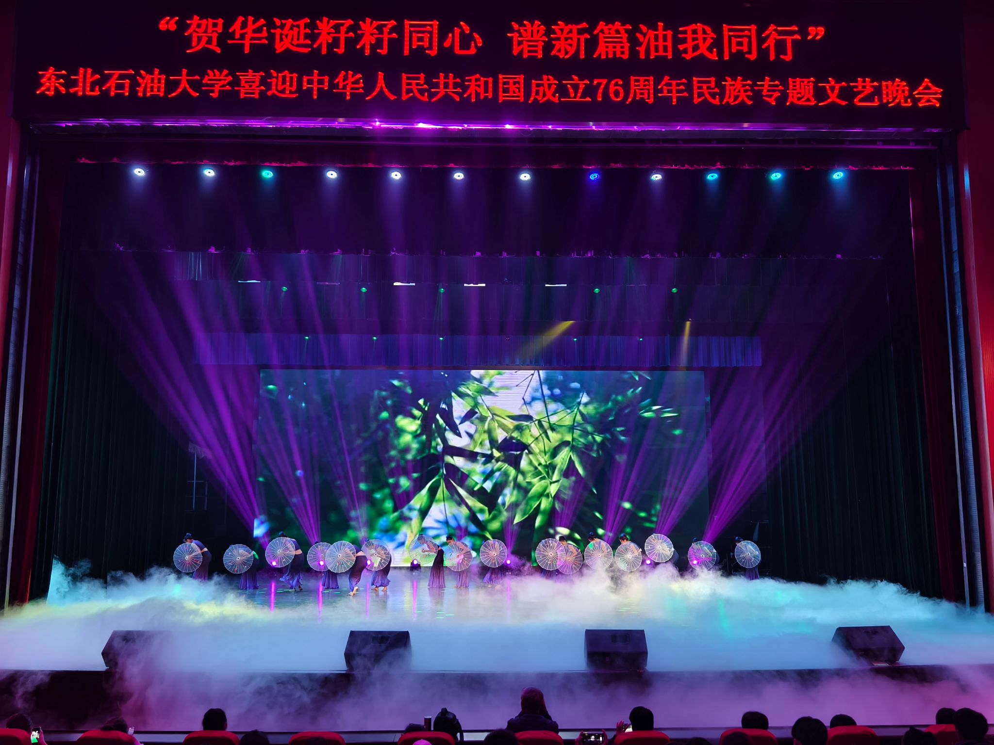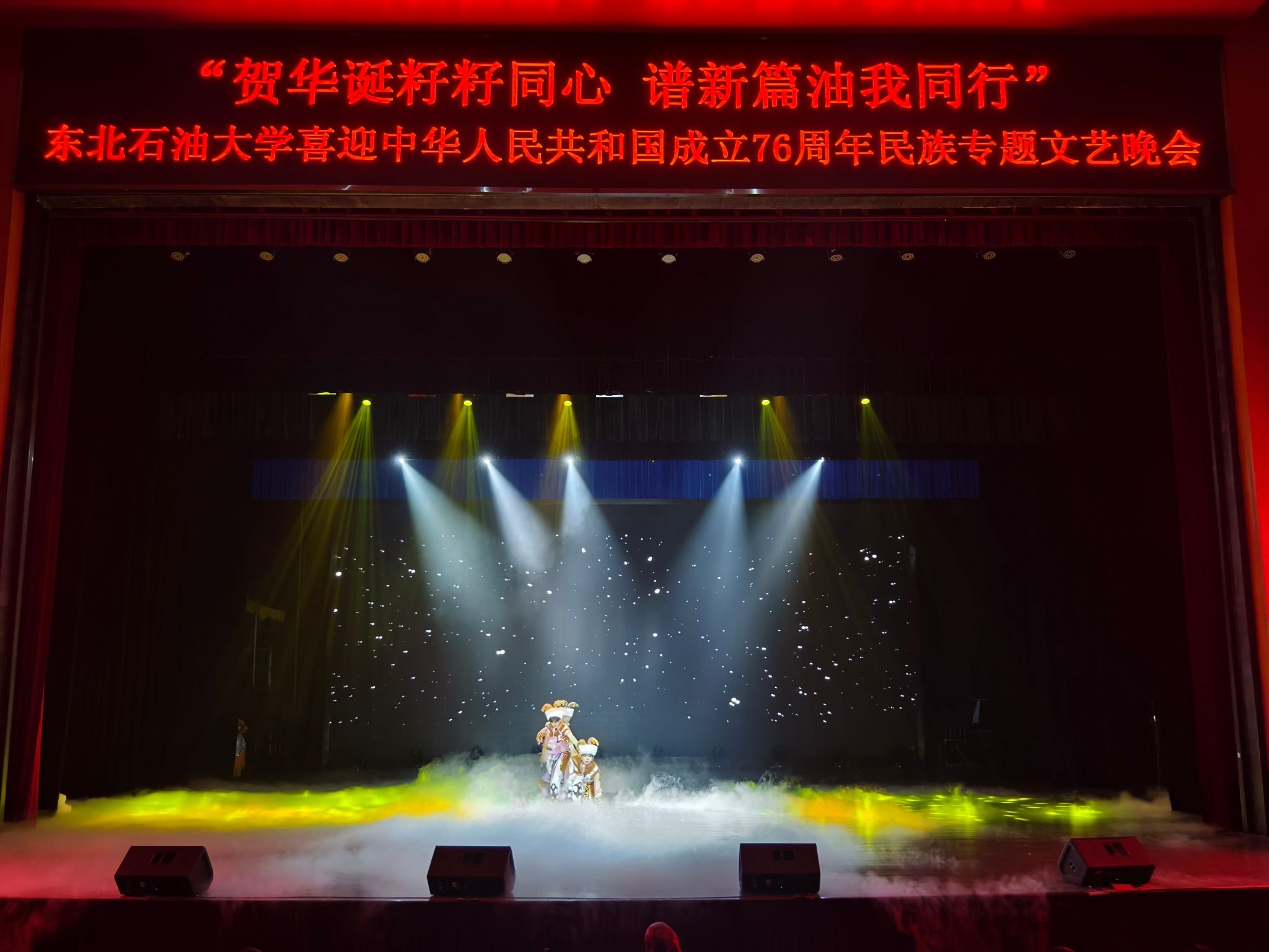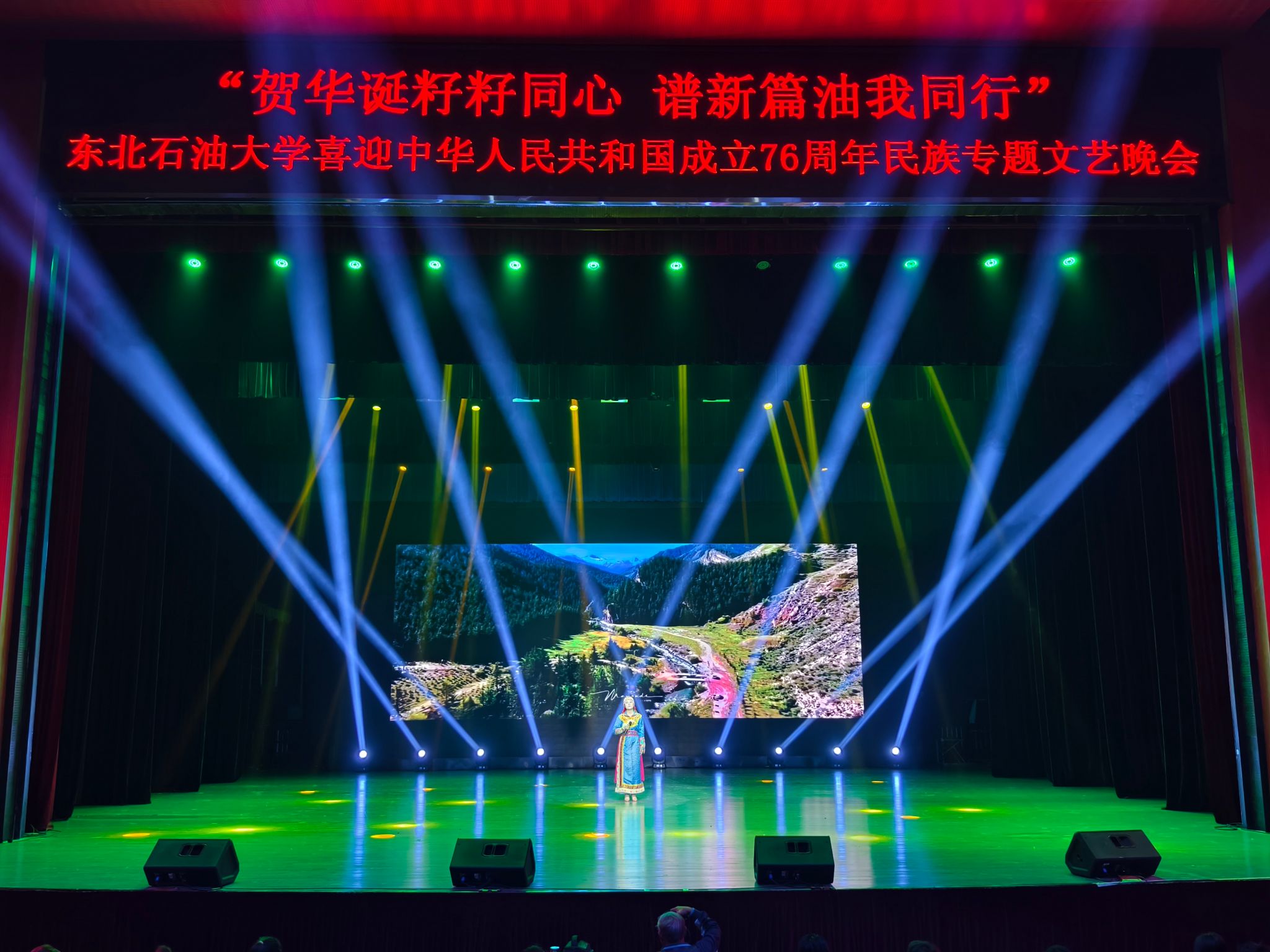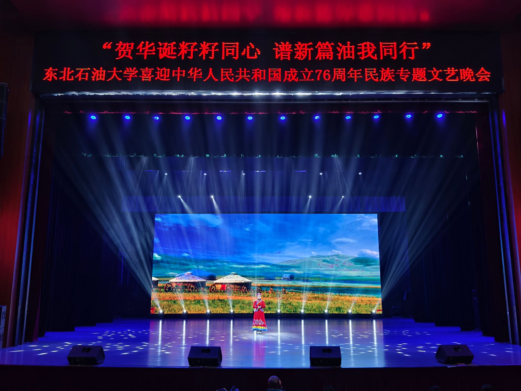 (通讯员 王书婷 记者/摄影 杨雨剑)为庆祝中华人民共和国成立76周年,深化民族团结进步教育,丰富“民族团结进步宣传月”活动内涵,9月27日晚,我校以“贺华诞籽籽同心 谱新篇油我同行”为主题,在音乐厅举办喜迎中华人民共和国成立76周年民族专题文艺晚会。校长董宏丽,校党委常委、组织部部长张智勇,校党委常委、宣传部部长徐清亮出席,校机关及二级学院相关负责人参加。本次晚会由党委统战部主办、大学生艺术团团总支承办、艺术学院协办,全校师生代表欢聚一堂,共赏民族文化盛宴,共话民族团结深情。