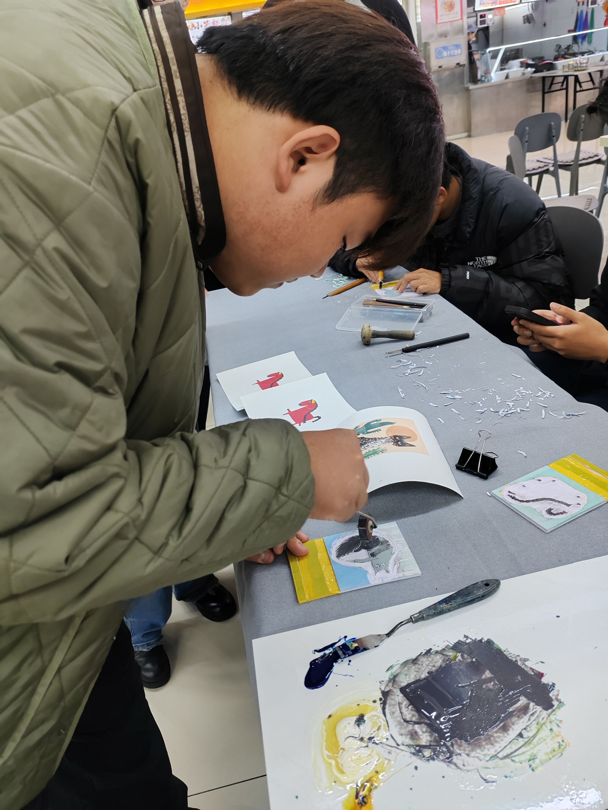 “以手践行,以心悟道”,非遗互动体验活动在三天内走进第一教学楼、教学主楼、音乐厅、二食堂、三食堂等,精选剪纸、版画、芦苇画、景泰蓝掐丝珐琅及拓片五项代表性技艺,邀请师生亲手参与创作。师生们在非遗传承人的指导下,拿起剪刀、画笔,专注地勾勒线条、裁剪图案,大家在亲手创作中零距离触摸中华民族共有的工艺瑰宝,领悟传统造物智慧与中国文化精神。